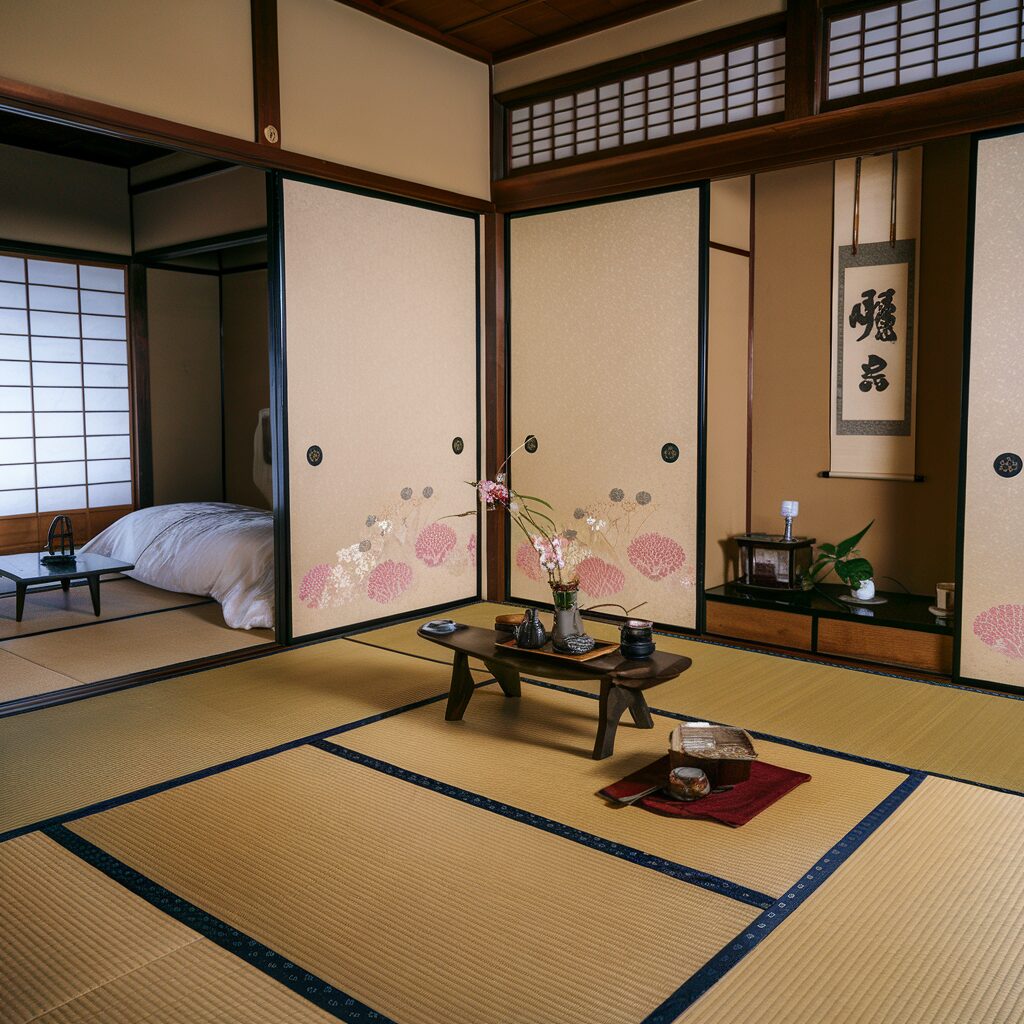 Low furniture — or no furniture — is common. People often sit on the floor using cushions (zabuton) or flat legless chairs (zaisu).